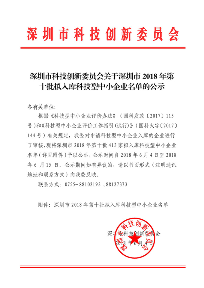經廣東省政府主管部門,深圳市科技創新委員會,深圳市福田區科創局的一致肯定,成功入庫“科技創新型企業”名單。