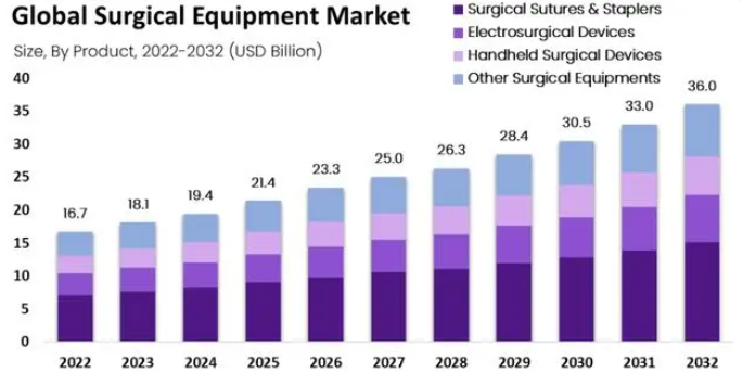 市場增長:手術設備市場預計到2032年將達到360億美元,從2022年的167億美元開始計算,年復合增長率(CAGR)為8.2%。
