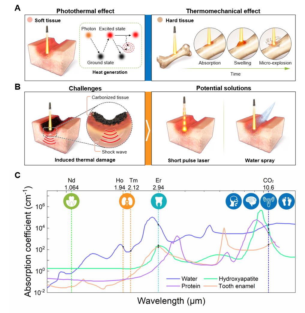 В отличие от традиционных хирургических инструментов, основанных на механической обработке, лазерный скальпель обеспечивает эффективную обработку биотканей благодаря своим уникальным тканевым оптическим эффектам. В статье описывается механизм фототермальной и фотомеханической абляции для удаления мягких и жестких тканей, а также обсуждается прогресс в исследованиях гидродиэлектрической и ультракороткоимпульсной лазерной технологии для уменьшения тепловых повреждений, таких как конденсация и карбонизация тканей (рисунок 1). Кроме того, в статье анализируются характеристики, преимущества и прикладная ценность инфракрасных медицинских источников света, основанных на лазерах Nd, Ho, Tm, ER и CO2, в различных хирургических областях, таких как стоматология и урология, и подчеркиваются основные проблемы, связанные с гибкостью, стабильностью и управляемостью лазерных передающих сред в результате прогресса новых хирургических лазерных источников света.