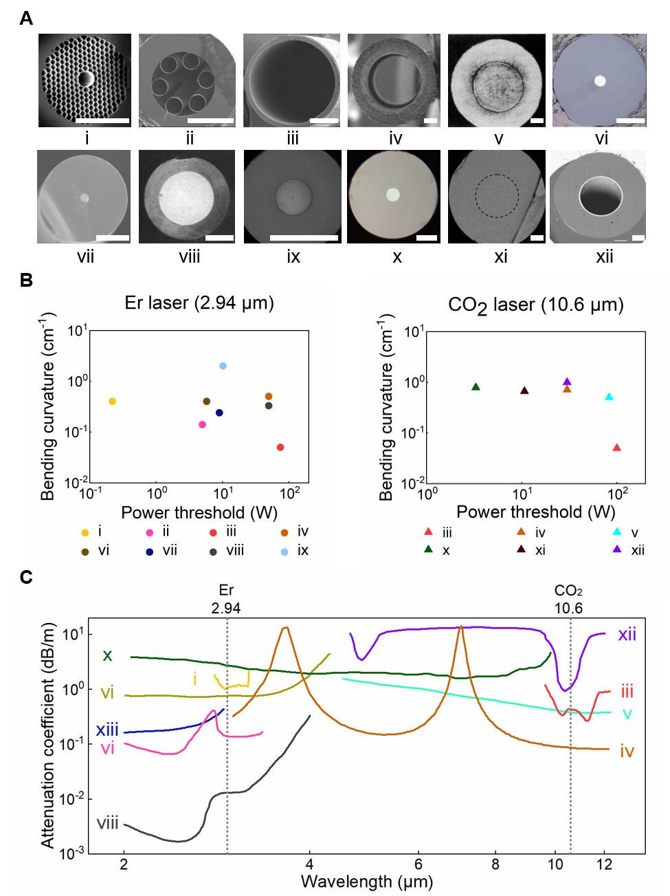 В качестве ключевого компонента лазерной системы скальпеля лазерная передающая среда должна стабильно доставлять энергию лазера в определенные хирургические участки. В этой системе описывается текущее состояние исследований трех основных медицинских лазерных передающих сред: оптических рукавов, полых волноводов и инфракрасного волокна, и подчеркивается потенциальное применение небольших, высокогибких инфракрасных волоконно - оптических устройств в минимально инвазивной хирургии. В статье всесторонне анализируется прогресс исследований инфракрасных волоконно - оптических устройств, сравниваются характеристики волоконно - оптических устройств в лазерах на эрбие и углекислом газе с точки зрения порога лазерной передачи, оптических потерь и механической гибкости (рисунок 2), указывая, что высокие оптические потери и низкая механическая прочность являются ключевыми факторами, ограничивающими глубокое применение инфракрасных волоконно - оптических устройств в хирургии. В последние годы быстрое развитие многоматериальной волоконно - оптической технологии позволило высокоинтегрировать композитные материалы с различными физическими свойствами, такими как свет, сила, электричество и магнит, что обеспечило надежную исследовательскую поддержку для разработки среднеинфракрасного волокна с высокой гибкостью и низкими потерями и дальнейшего улучшения функциональности хирургического оборудования.